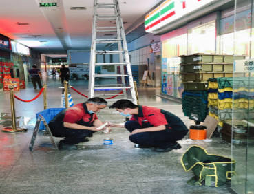 近日工程部接报中心商务大厦一楼后大堂西面天花有较大范围漏水现象。在一个将近7点的傍晚,我看到了工程部经理骆泽彬与工程同事吴盈飞,两人正在后大堂西面通道,正在蹲着说着话。