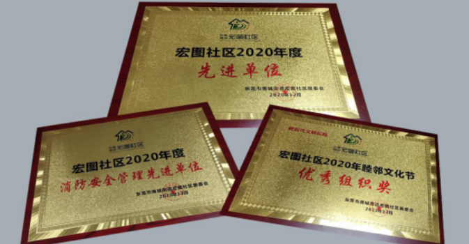 在晚会颁奖仪式上,一批社区先进单位获得表彰,其中天利物业东莞分公司分别获得“宏图社区2020年度先进单位”、“宏图社区2020年度消防安全管理先进单位”和“宏图社区2020年睦邻文化节优秀组织奖”三项殊荣。
